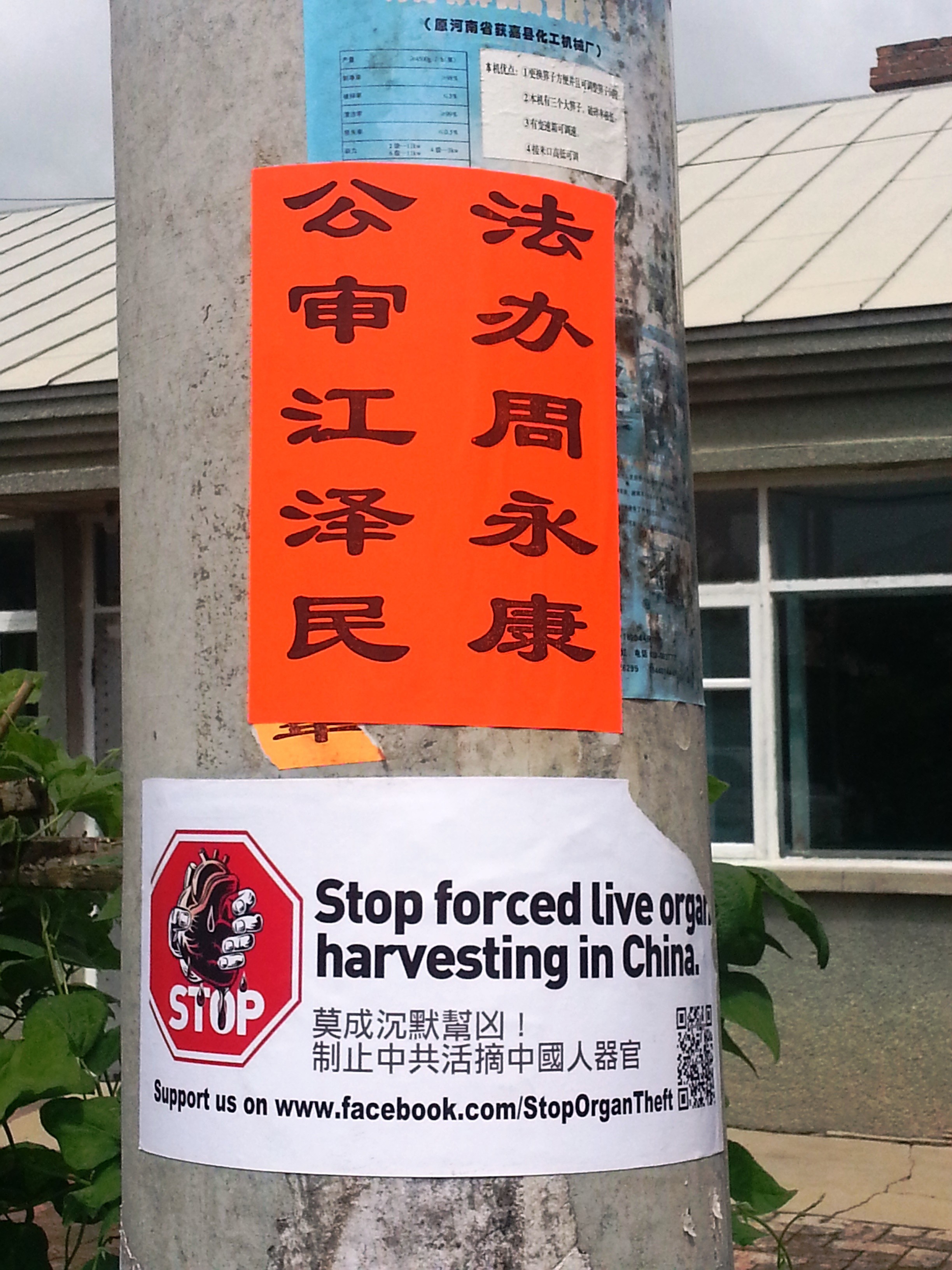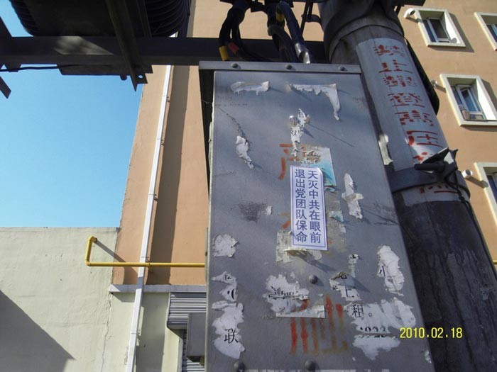 法轮功学员在东北地区的住宅楼墙,电线杆,等处张贴不干胶曝光中共苏家屯集中营