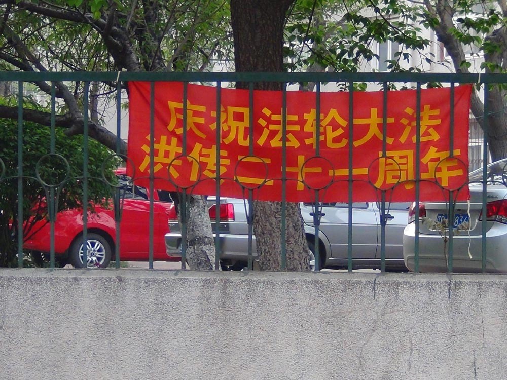 东北某市大法弟子挂横幅庆祝世界法轮大法日