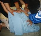 北京女子监狱的野蛮转化,图为强迫弯腰,腰弯不下去,两个人骑上去压