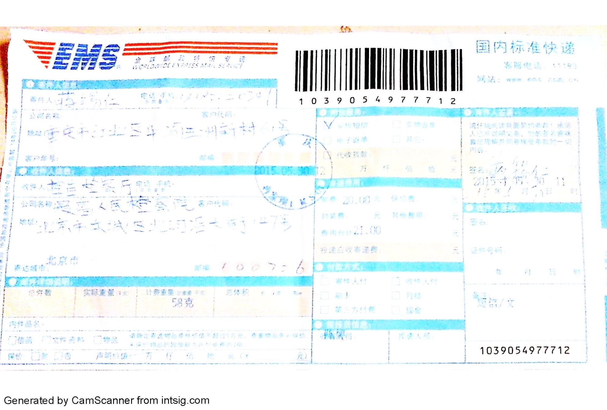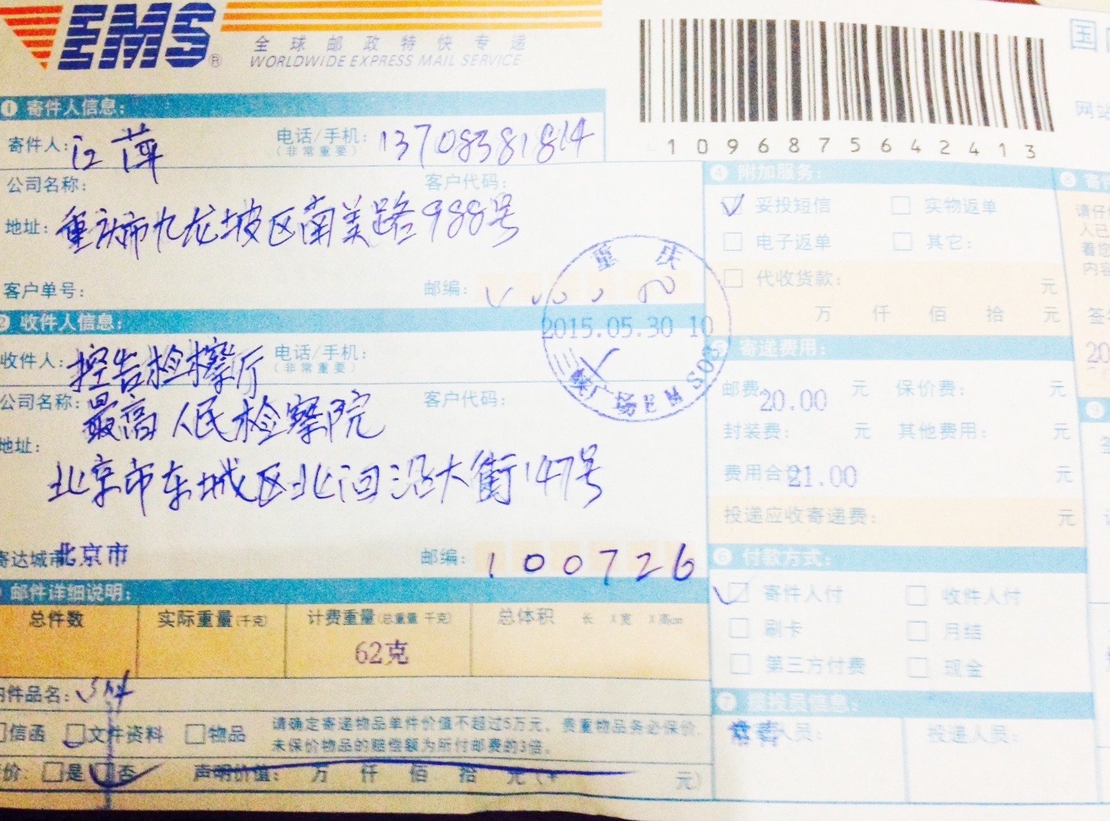 附:杜汉文寄信凭证和签收短信凭证