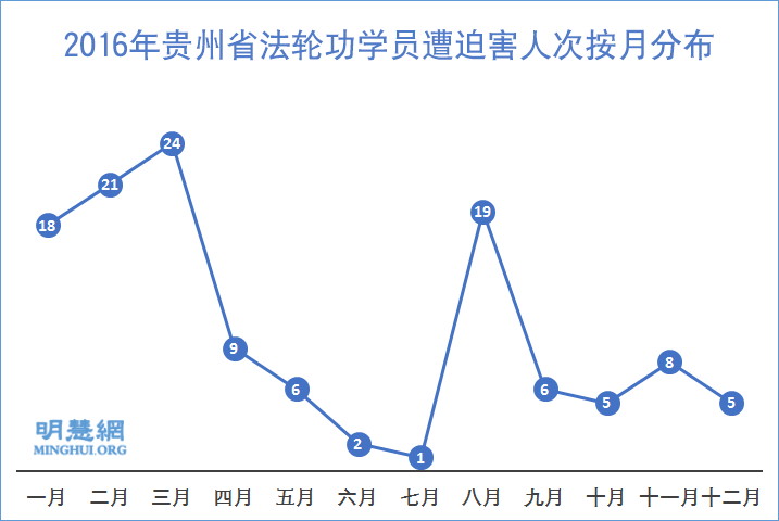 2016年贵州省法轮功学员遭迫害人次按月分布