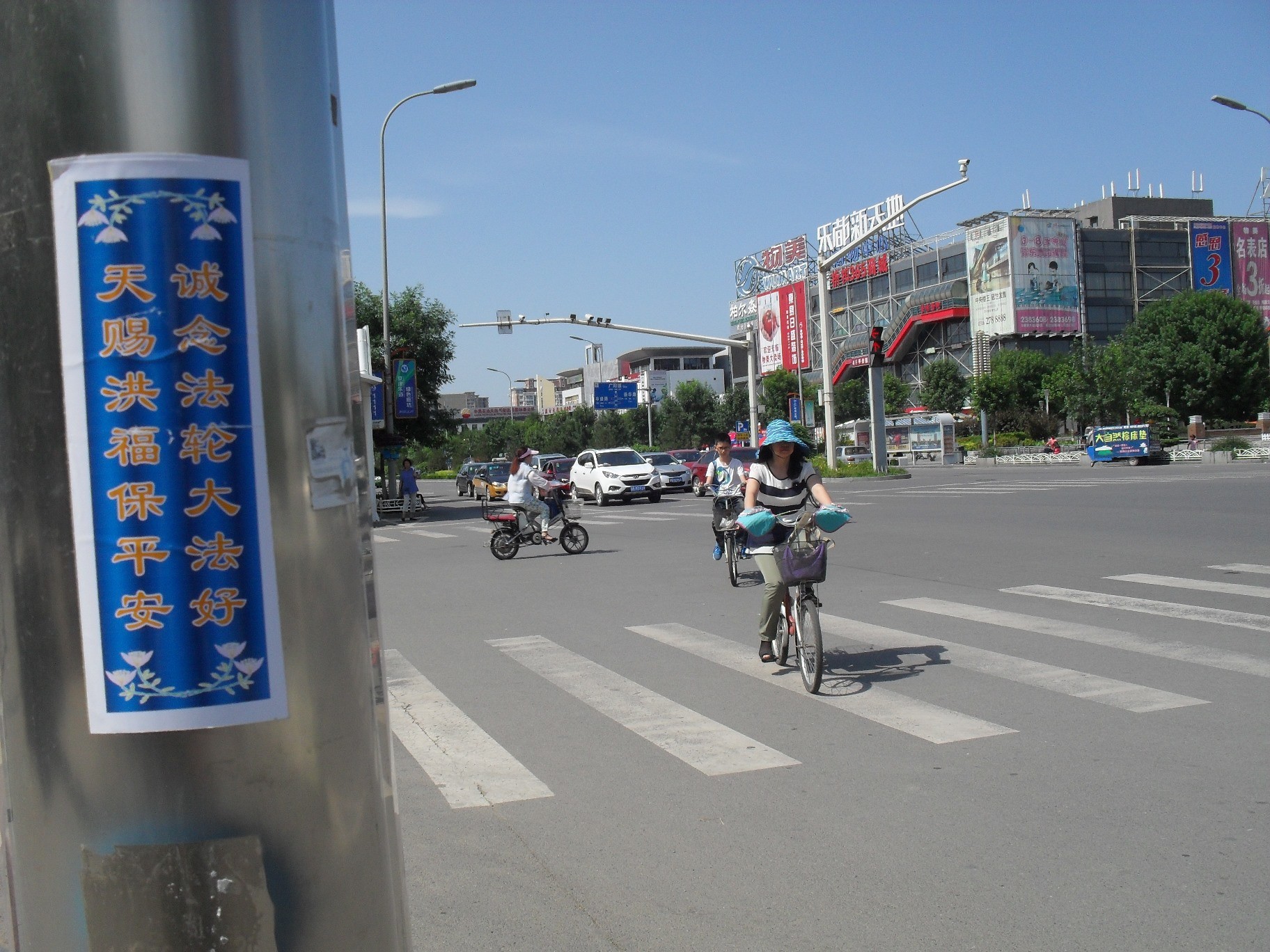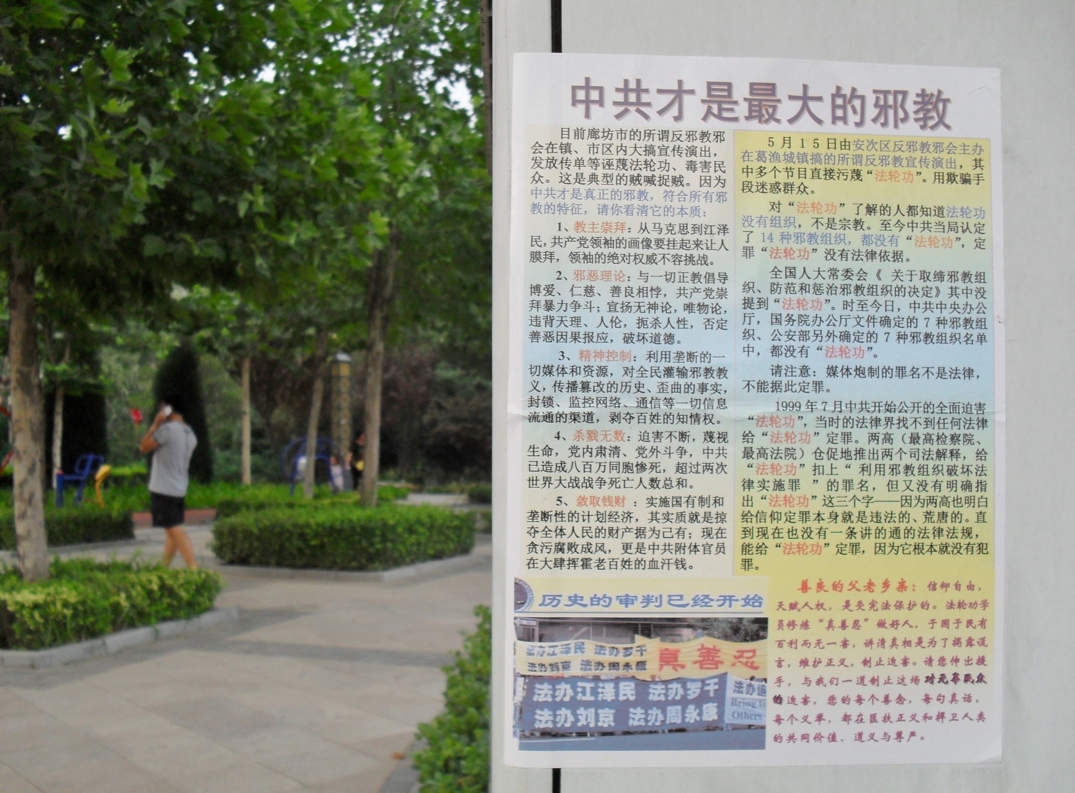 保定新市区检察院以藉电视插播对学员非法起诉,图为:伪法院对面电线杆上贴着的传单。