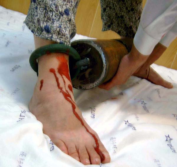 酷刑演示:大庆劳教所给有的学员戴的脚镣约有30多斤重 一戴就是一个月