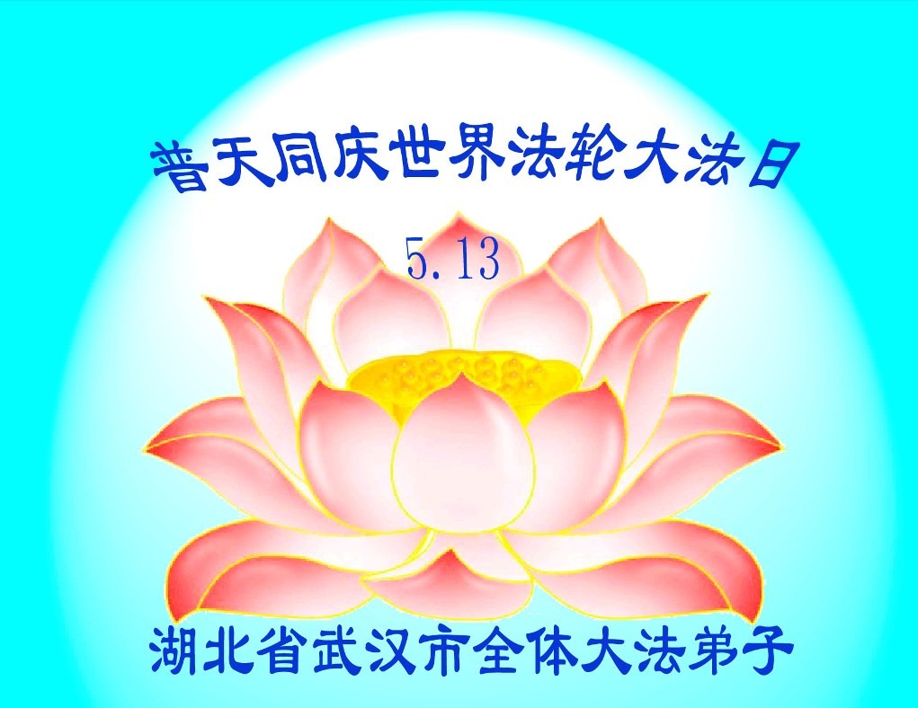 由5000多武汉法轮功学员集体炼功,列队组字,上部分为法轮图形,下部分为"真善忍" 中国,武汉