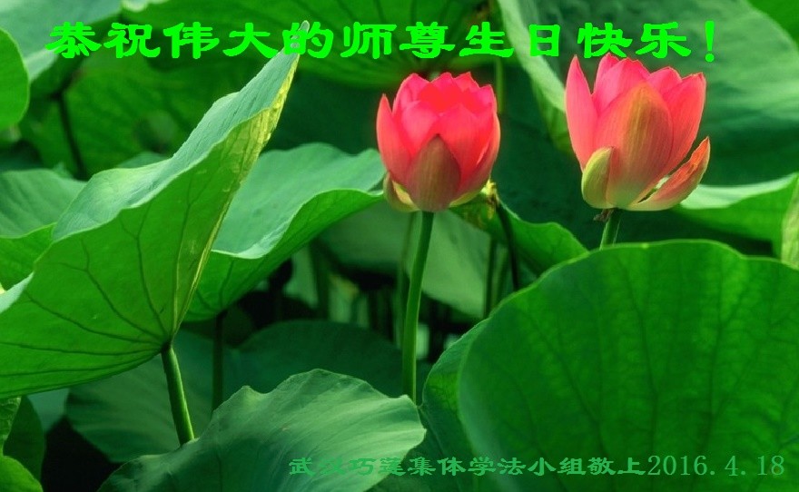 在"二零一四年世界法轮大法日"来临之际,湖北省武汉市硚口区一学法小组恭祝师尊生日快乐