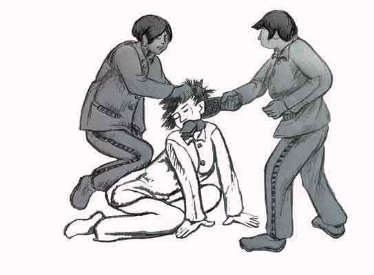 吉林省女子监狱对法轮功学员的残酷迫害,示意图:一窝蜂拽、摁,