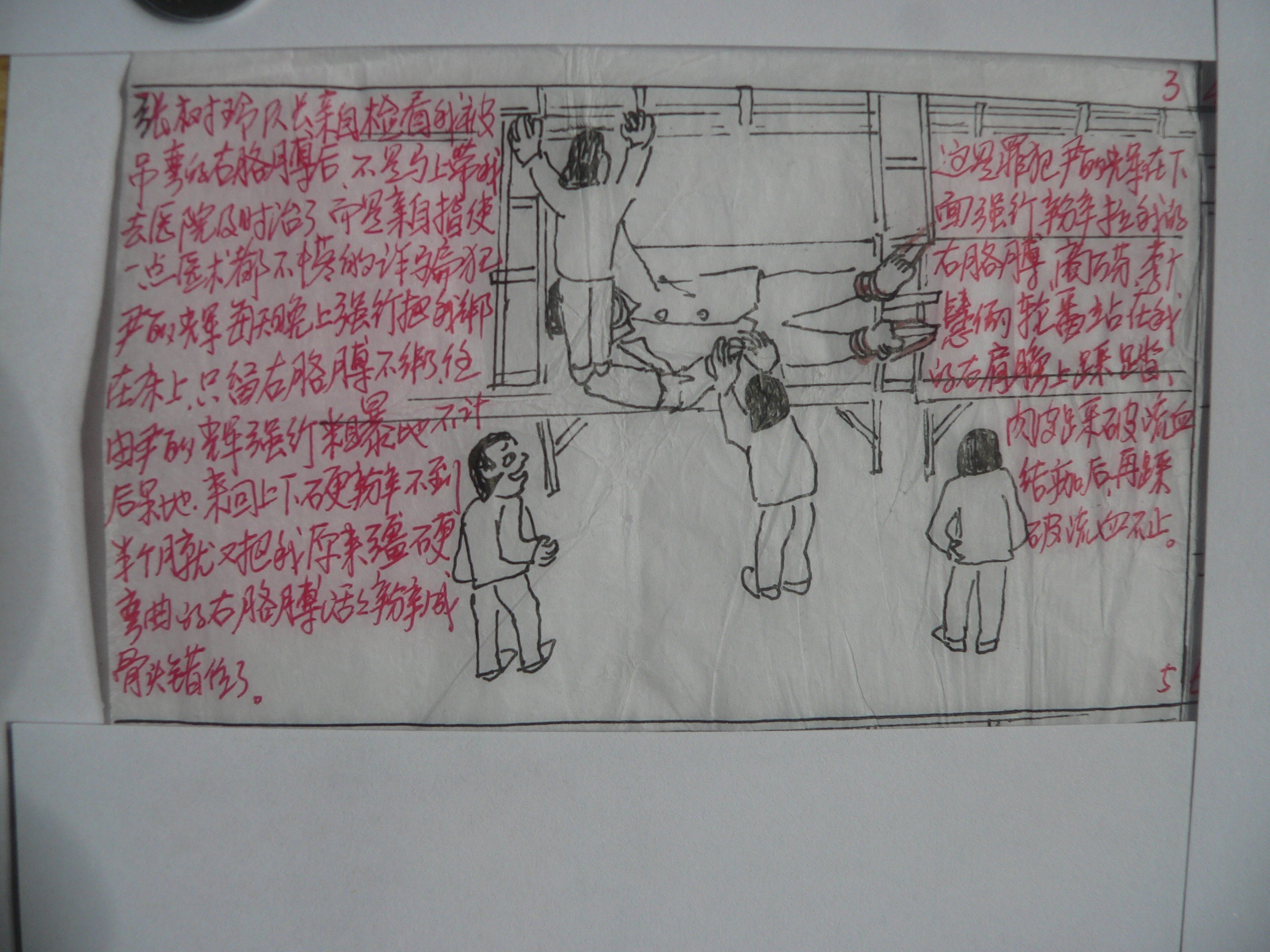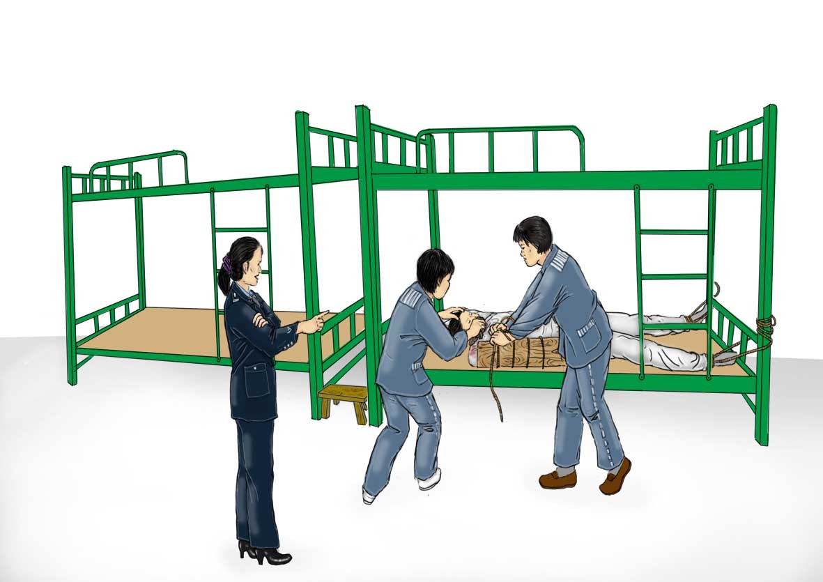 吉林市第一看守所、黑嘴子女子监狱的酷刑迫害演示图---6. 绑在死人床上遭野蛮灌食