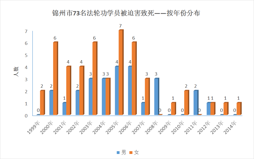 锦州市73名被迫害致死的男性和女性法轮功学员按年度分布情况