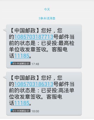 董敬雅二零一五年五月二十九日收到中国邮政短信:已妥投,最高检单位收发章签收;已妥投,最高法单位收发章签收