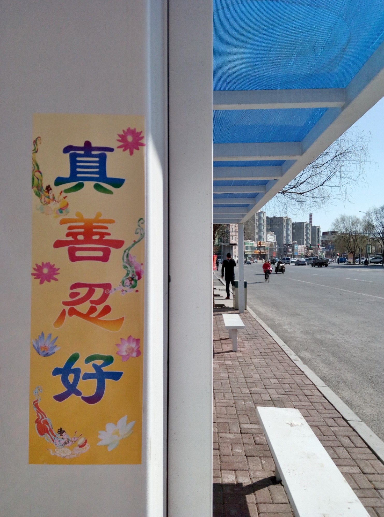 庆祝大法日,辽宁某市悬挂条幅告知世人"真善忍好"