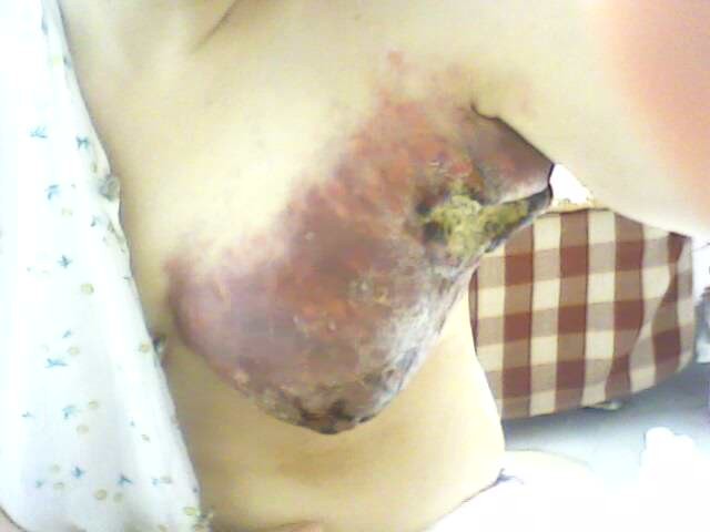 王红霞,47岁,奥运前被非法劳教迫害才半年折磨得腋下、乳房上出现肿瘤,图为遭迫害后身体