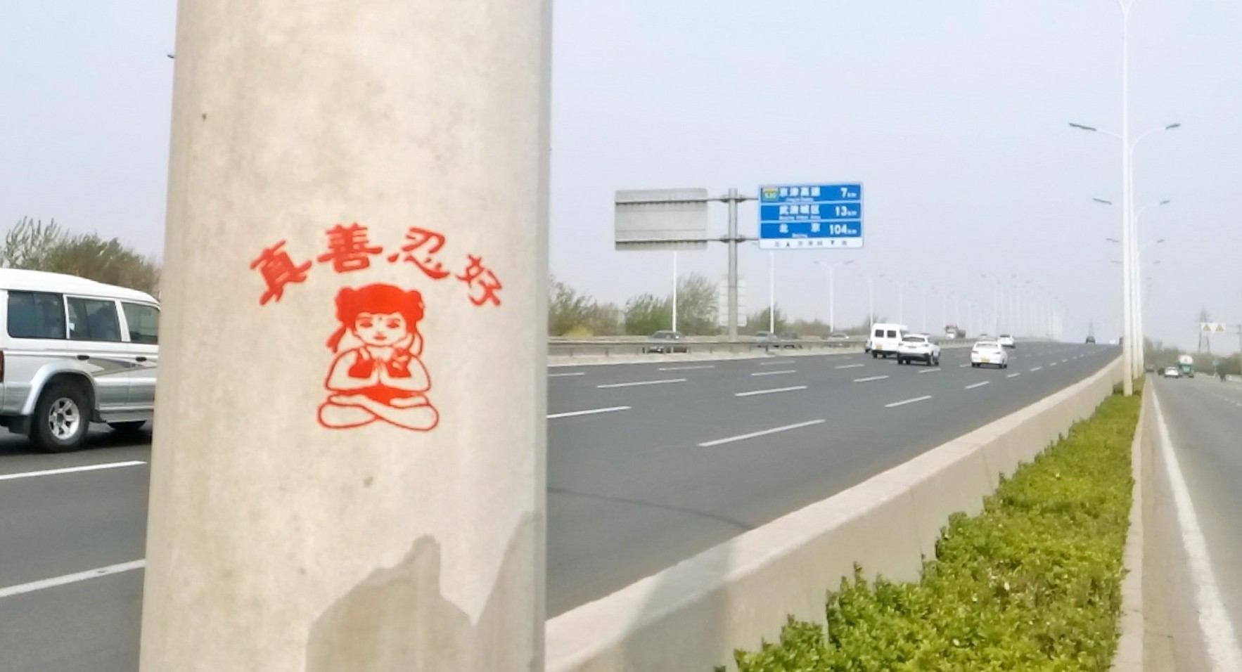 手扶拖拉机,停在天津市滨海监狱对面,"尊重生命、尊重人权、尊重法律"的横幅