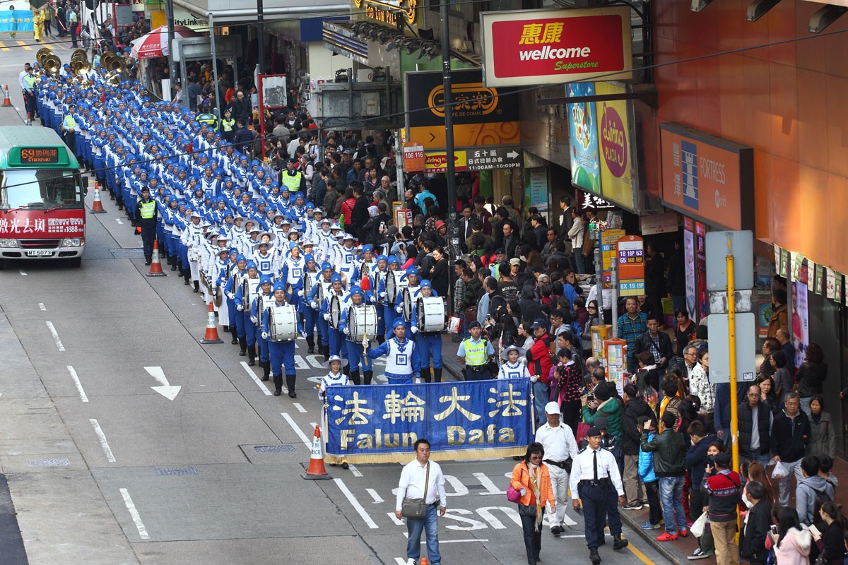法轮功学员的游行队伍在天国乐团的引领下,浩浩荡荡走过九龙区闹市,沿途吸引民众聚焦并拍照