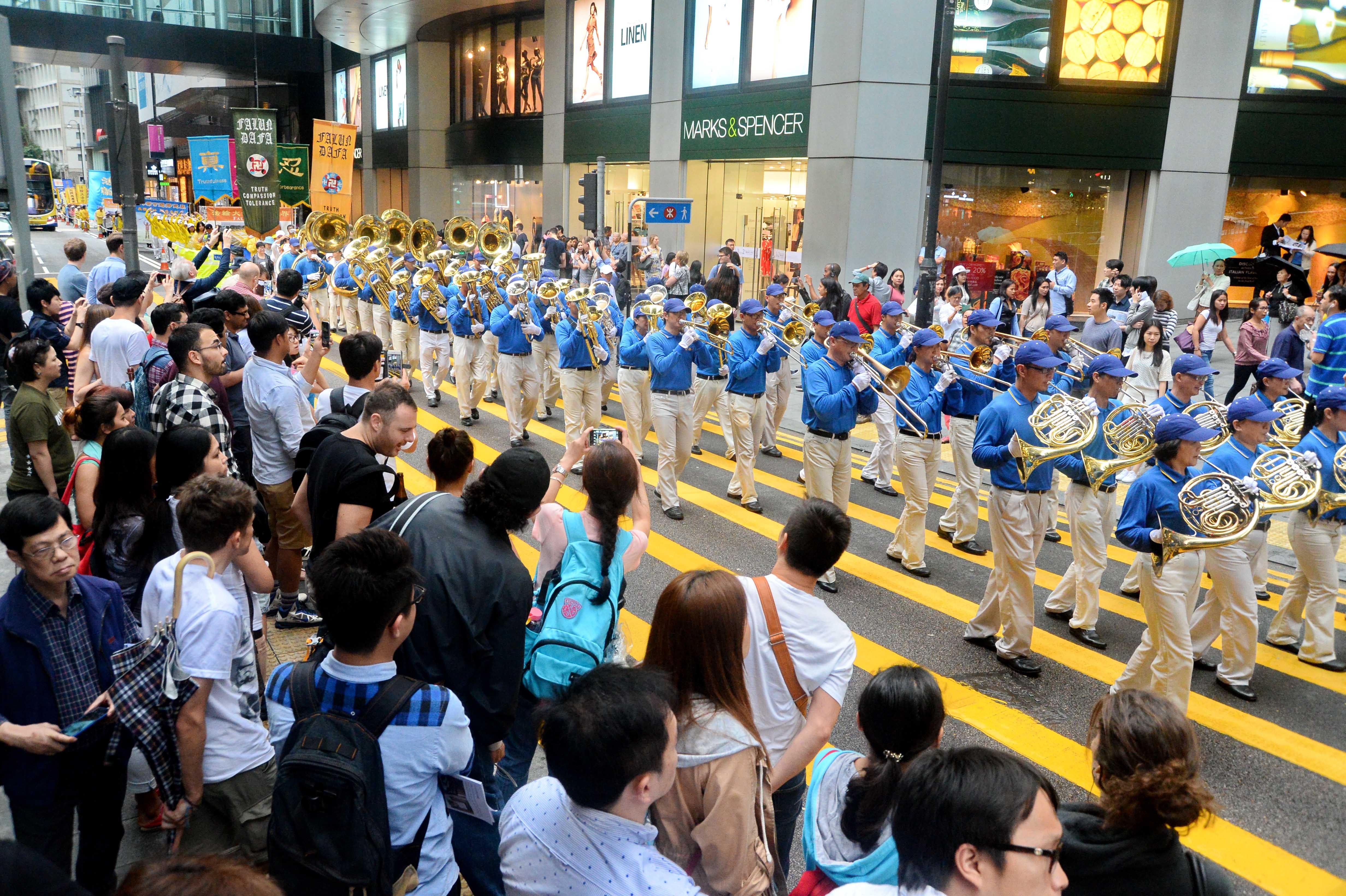 反迫害游行队伍在天国乐团领头下,在港岛区的闹市前进