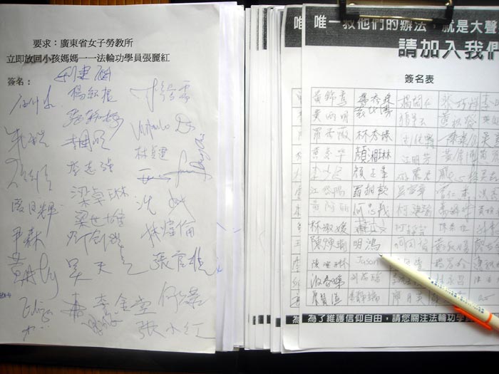 香港议员及市民呼吁中共释放港人法轮功学员的妻子张丽红,图为近二千名市民签名要求释放张丽红