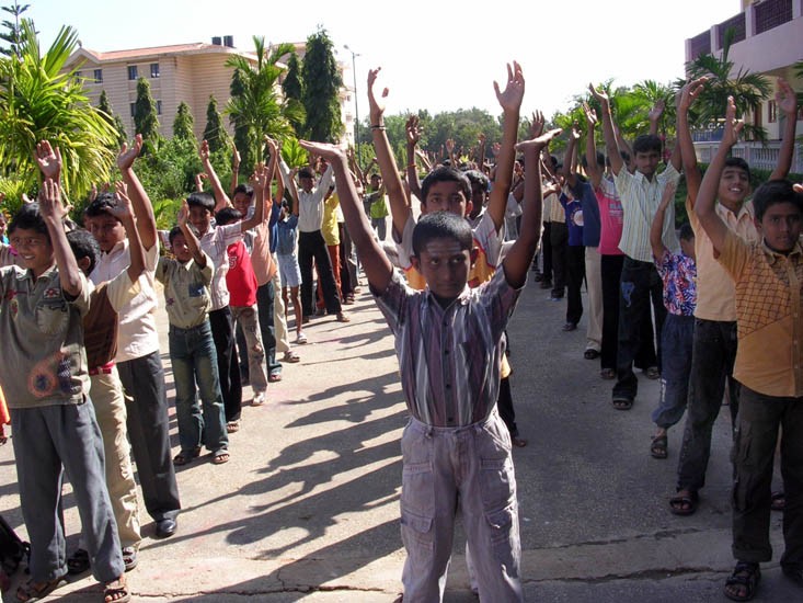 印度Bangalore洪扬法轮大法图为Byreshawara school小学生炼功