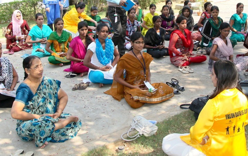 法轮功学员在印度东北部向学生介绍法轮功,并教授功法,受到欢迎。