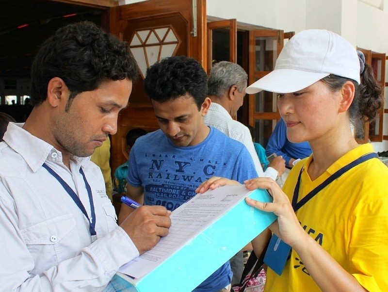 法轮功团体在西印度传播真相,图为贵宾签名支持反对活摘器官