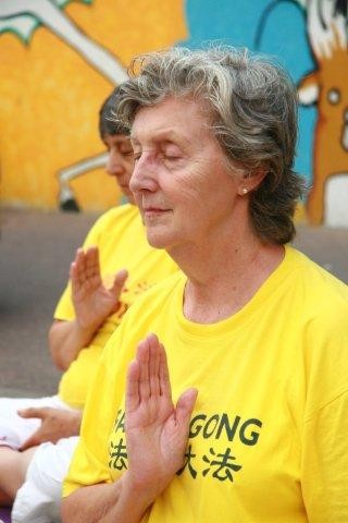 法轮功学员在以色列海滋利亚购物休闲中心,举办弘法活动,演示功法