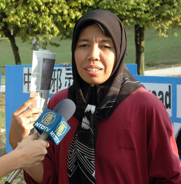 法轮功学员于"七•二零"之际在吉隆坡举办"真善忍画展"图为民众接受采访遣责中共的暴行.