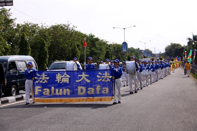 印尼法轮功受邀游行中共伸黑手阻挠图为受阻参加游行的天国乐团和腰鼓队.