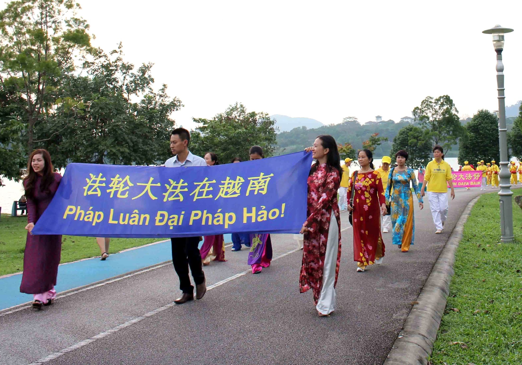 远道而来的越南法轮功学员,穿着亮丽的传统服饰参加游行