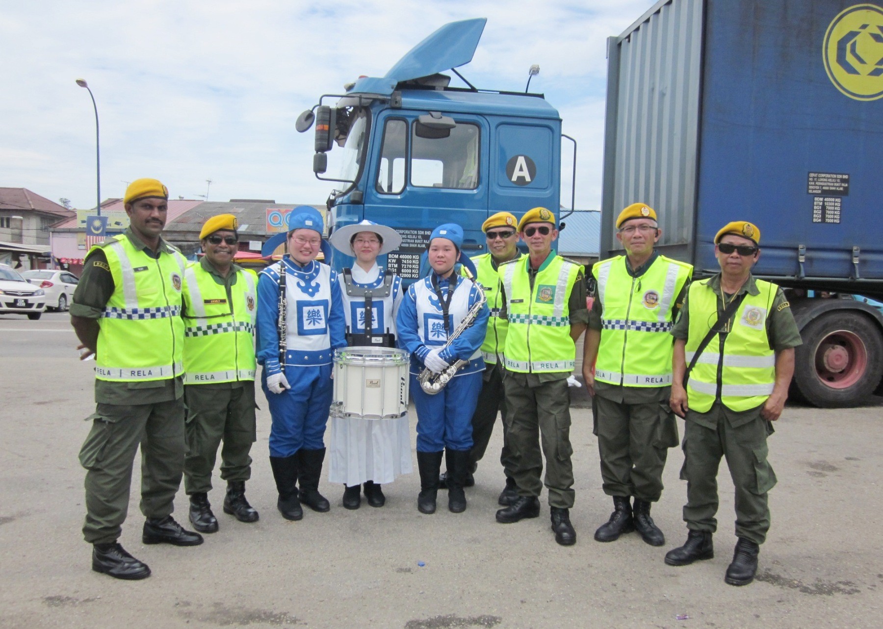 加叻游行结束后,志愿警卫队与天国乐团成员拍照留念。 加叻游行结束后,志愿警卫队与天国乐团成员拍照留念