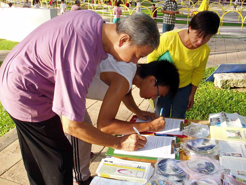 法轮功学员在马来西亚槟城青年公园举行反酷刑活动 图为记者签名支持
