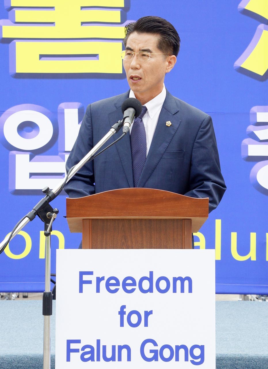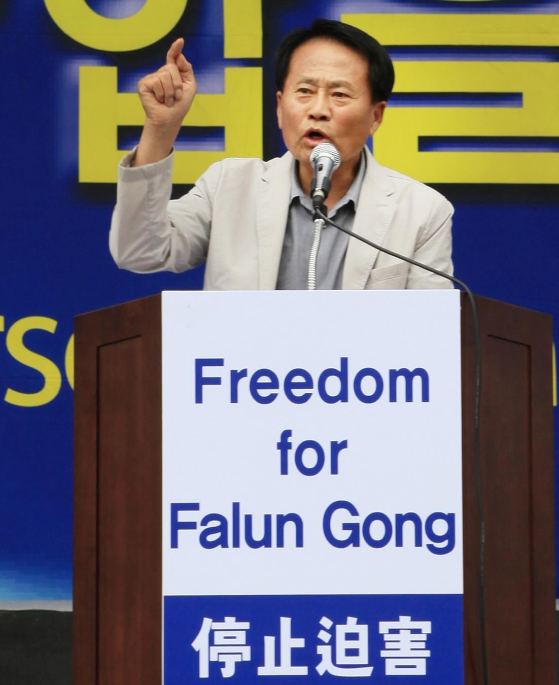 法轮功学员在首尔广场举行集会,图为人权活动家金尚宪发言
