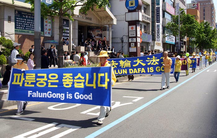反迫害6周年 法轮功学员韩国首尔市大规模游行 呼吁制止中共对法轮功的野蛮镇压 图为游行吸引了路人的关注