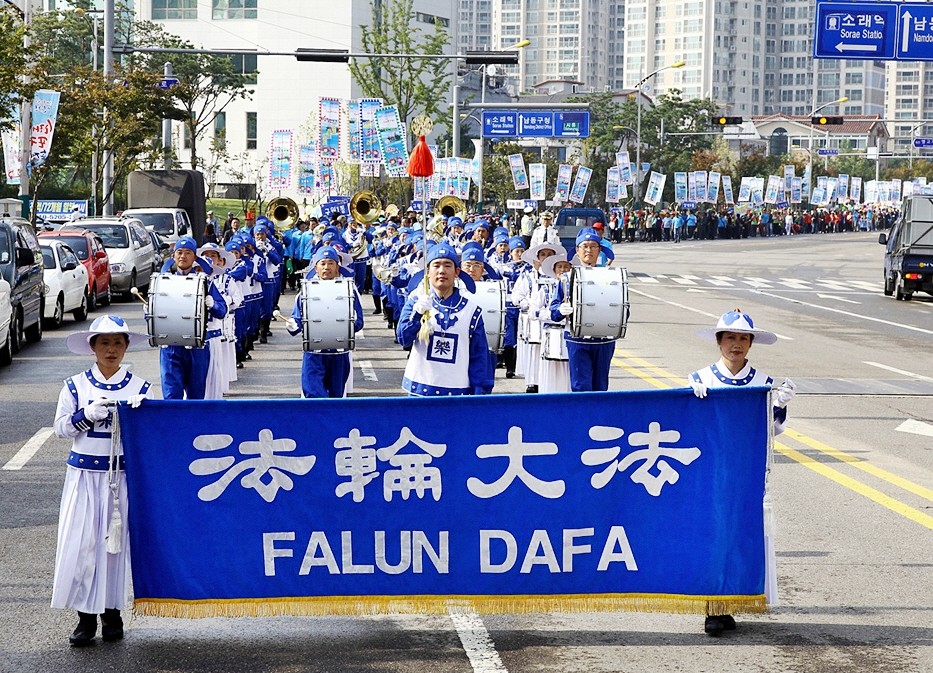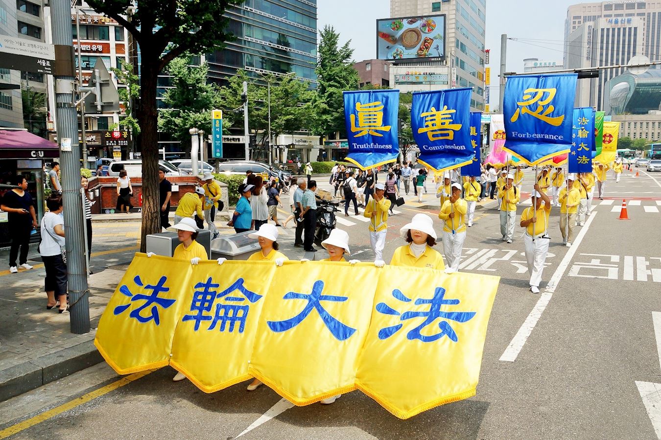法轮功学员在首尔展现法轮大法和反迫害的盛大游行。
