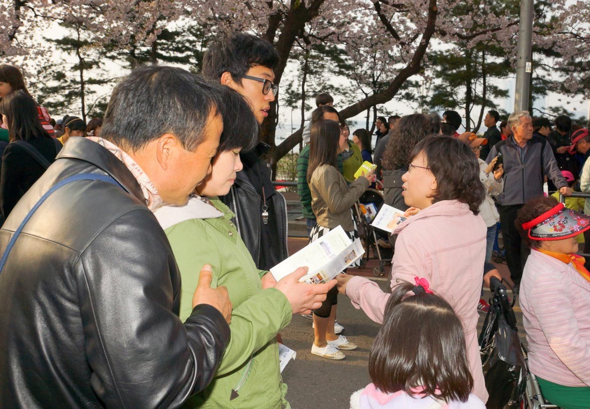 韩国法轮功学员法轮功学员如意岛樱花节举办法轮功真相图片展,介绍法轮大法及在中国的迫害真相