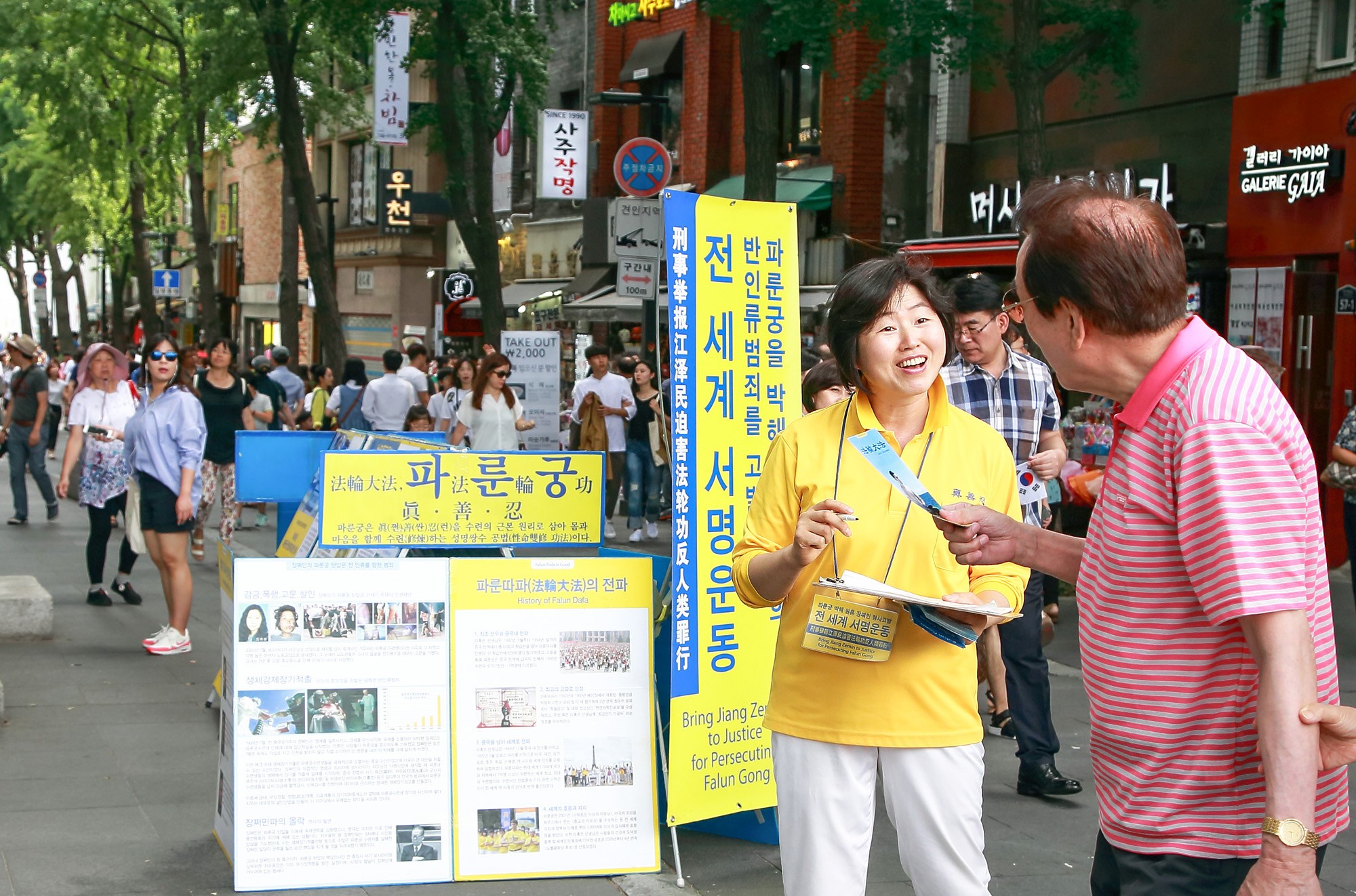 法轮功学员在首尔市中心炼功,民众看展板,了解法轮功真相