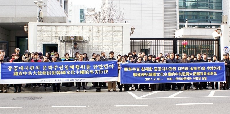韩国法轮功学员中领馆前集会抗议中共虐杀法轮功学员高蓉蓉