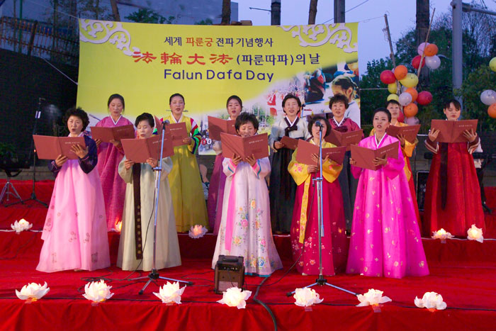 韩国法轮功学员在大邱举办世界法轮大法日庆典活动图为学员们合唱2007-5-13