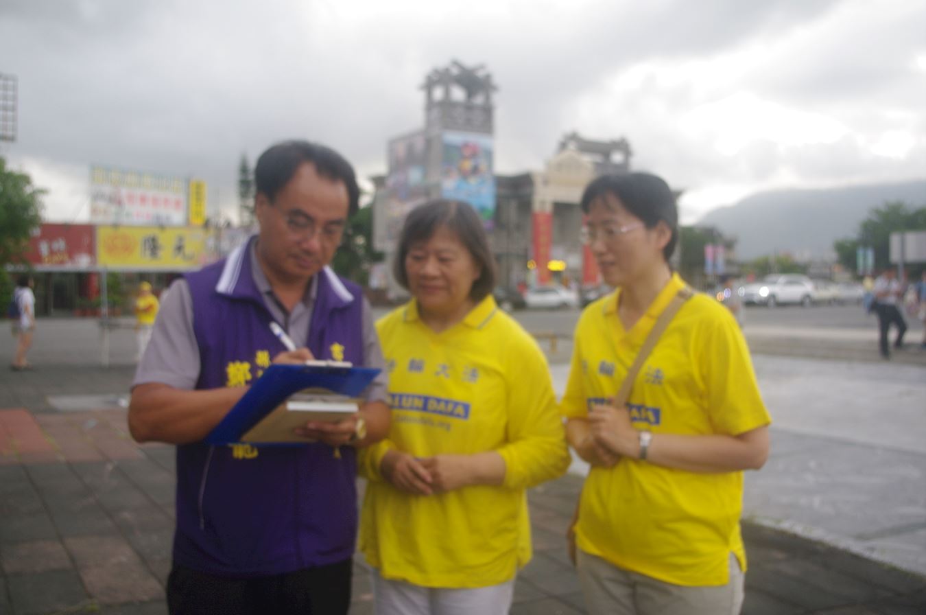 法轮功学员在花莲火车站前广场炼功弘法讲真相活动,并征集民众签名