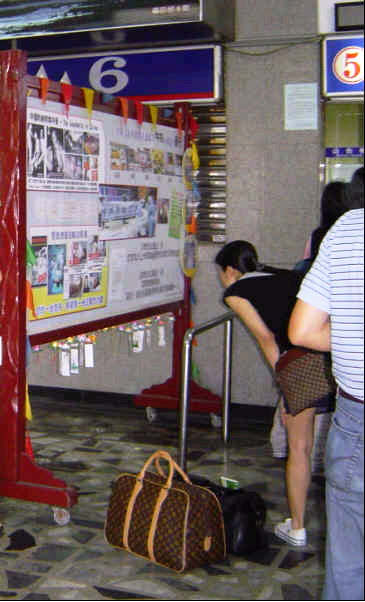 台湾法轮功学员在花莲火车站设置的"希望墙"图为旅客观看希望墙上的谴责活摘器官海报