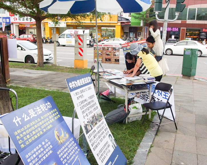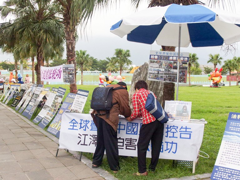 台湾花莲法轮功学员举办真善忍美展 图为民众索取真相资料