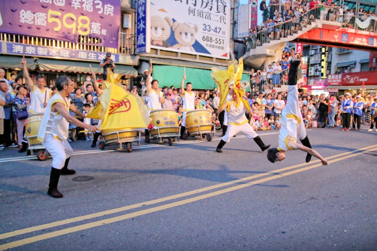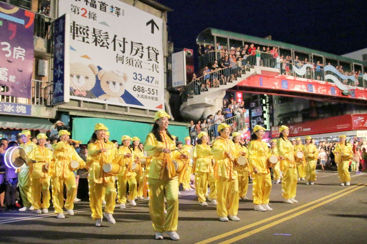台湾"头份四月八"踩街,法轮功腰鼓队获奖图为新唐人台湾旗鼓队