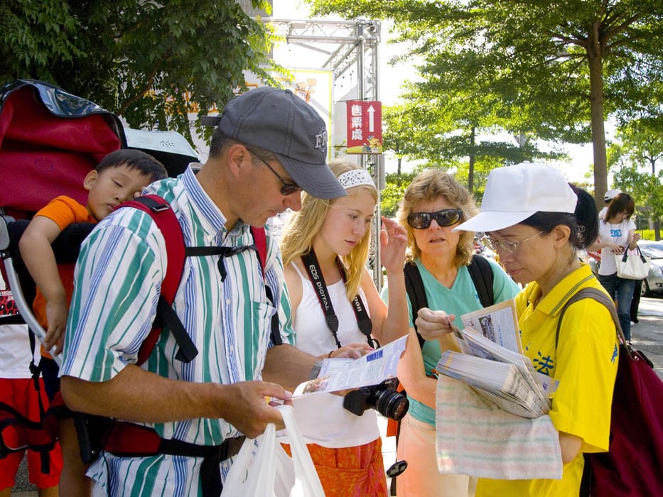 法轮功真相吸引遊客的关注。为大陆遊客打开了解真相的门窗,提供给可贵的中国人获得崭新生命的契机