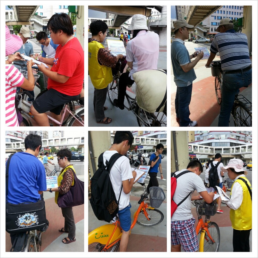 台北学员在中央联合办公大楼洪法向路过民众或同仁发放真相材料
