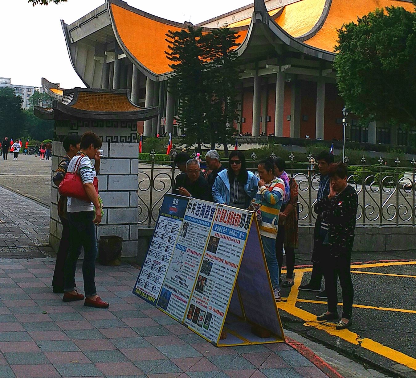 法轮功学员在国父纪念馆前讲真相,观看展现展板的游客一批接一批