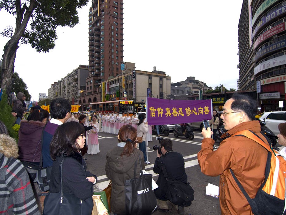 法轮功学员参加关渡节共襄盛举踩街游行活动,里长称赞法轮功