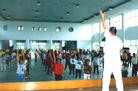 2002年台南市寒假教师法轮功研习活动中学员在集体炼功 台湾 台南市 2002-1