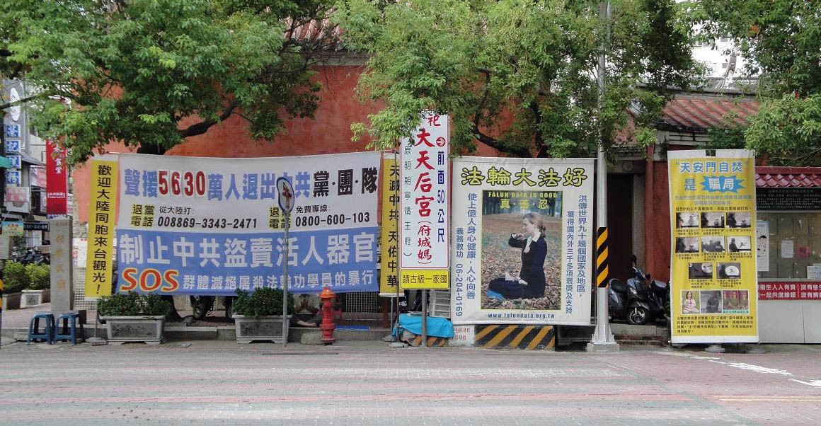 台南市一级古迹的真相景点:武庙墙壁的法轮功真相展板