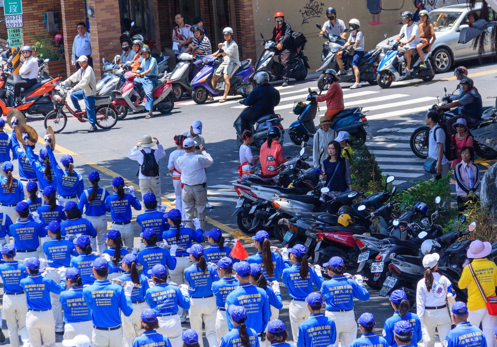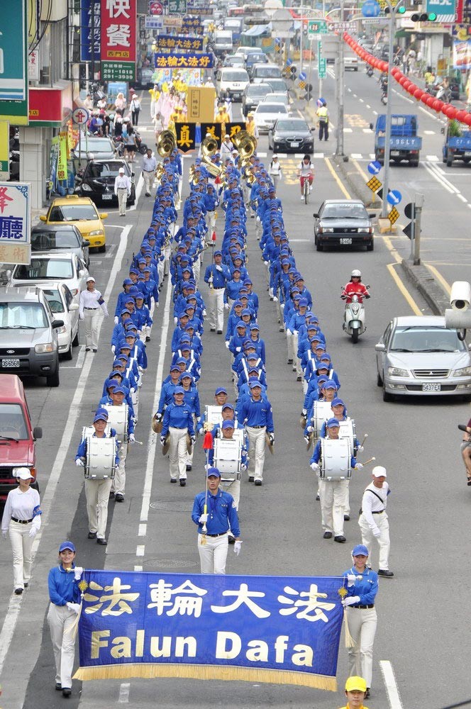 台南部分法轮功学员遊行庆祝世界法轮大法日,庆祝活动由阵容庞大的天国乐团前导,吸引了很多民众夹道欢迎