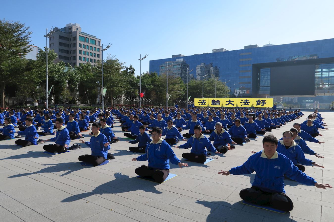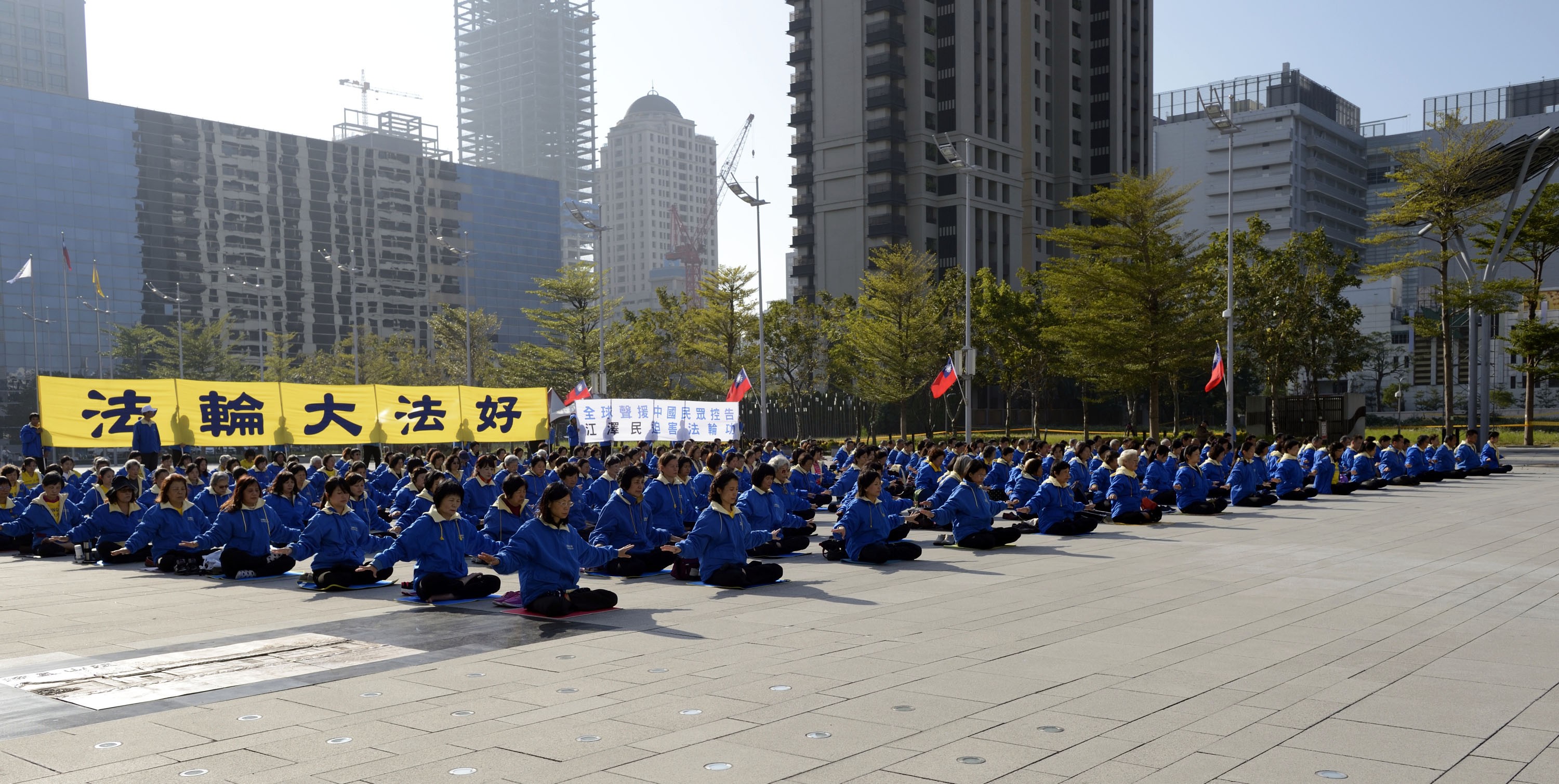 法轮功学员在台中市政府的大广场上炼功。
