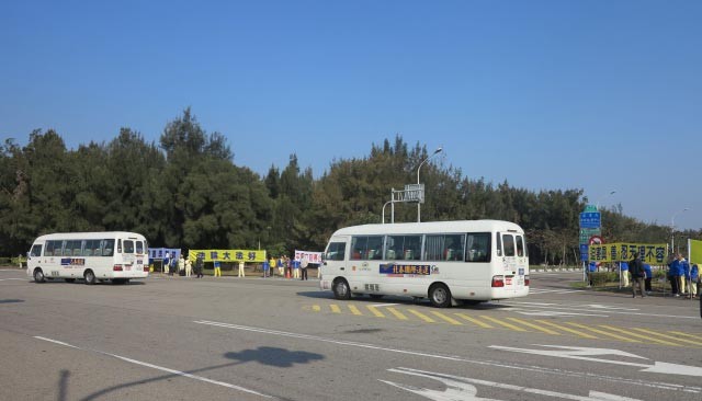法轮功学员在台中科学园区前,持横幅"法轮大法好",向中共代表喊话