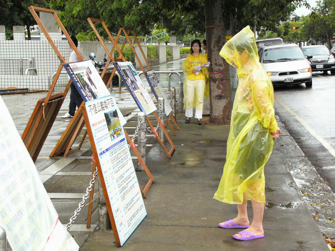 台中学员风雨中悼"7·20" 呼吁共同制止迫害 图为民众在风雨中观看真相图片
