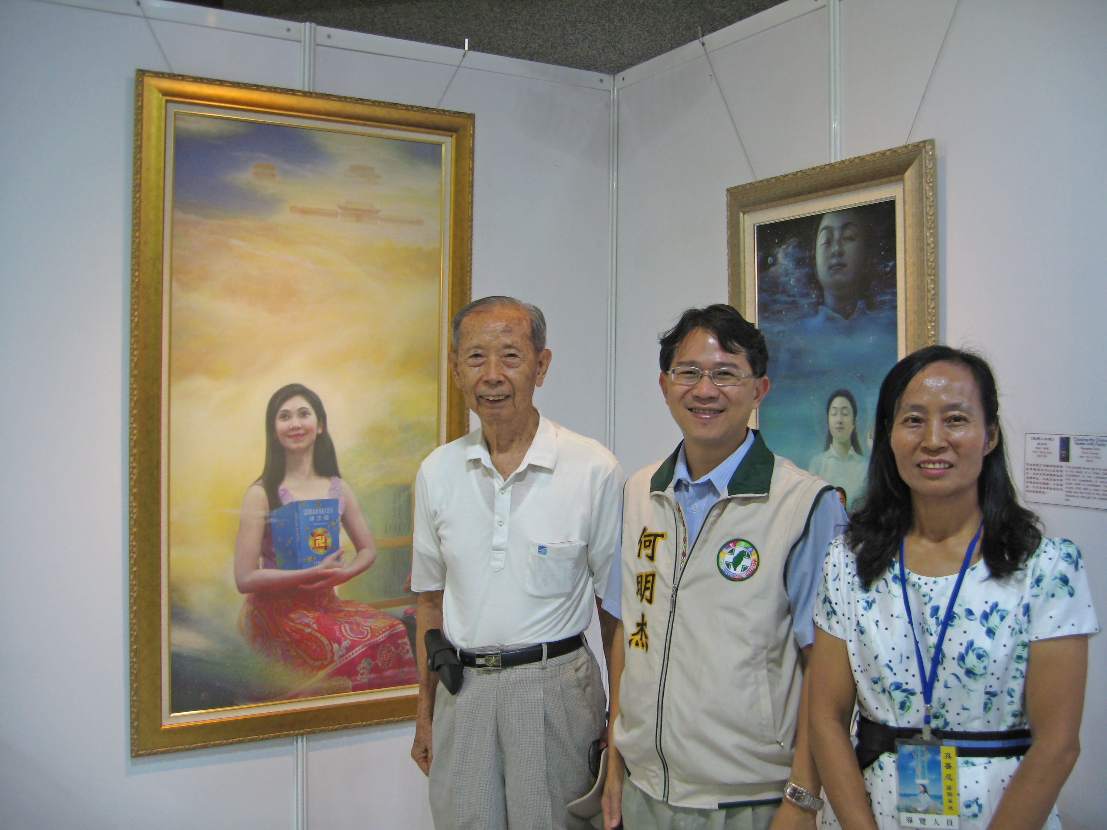 《真善忍国际美展》在台中县展出图为清溪文艺学会理事长郭禹君接受采访